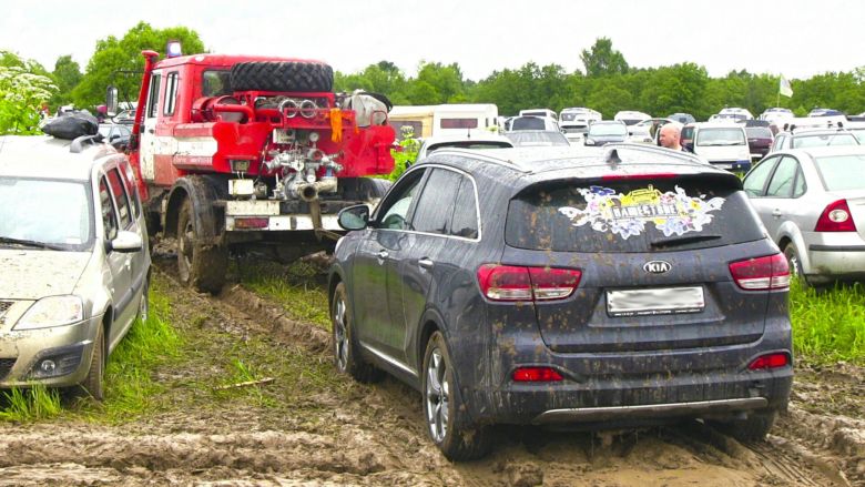 В грязевой ловушке на парковке фестиваля оказались тысячи автовладельцев.